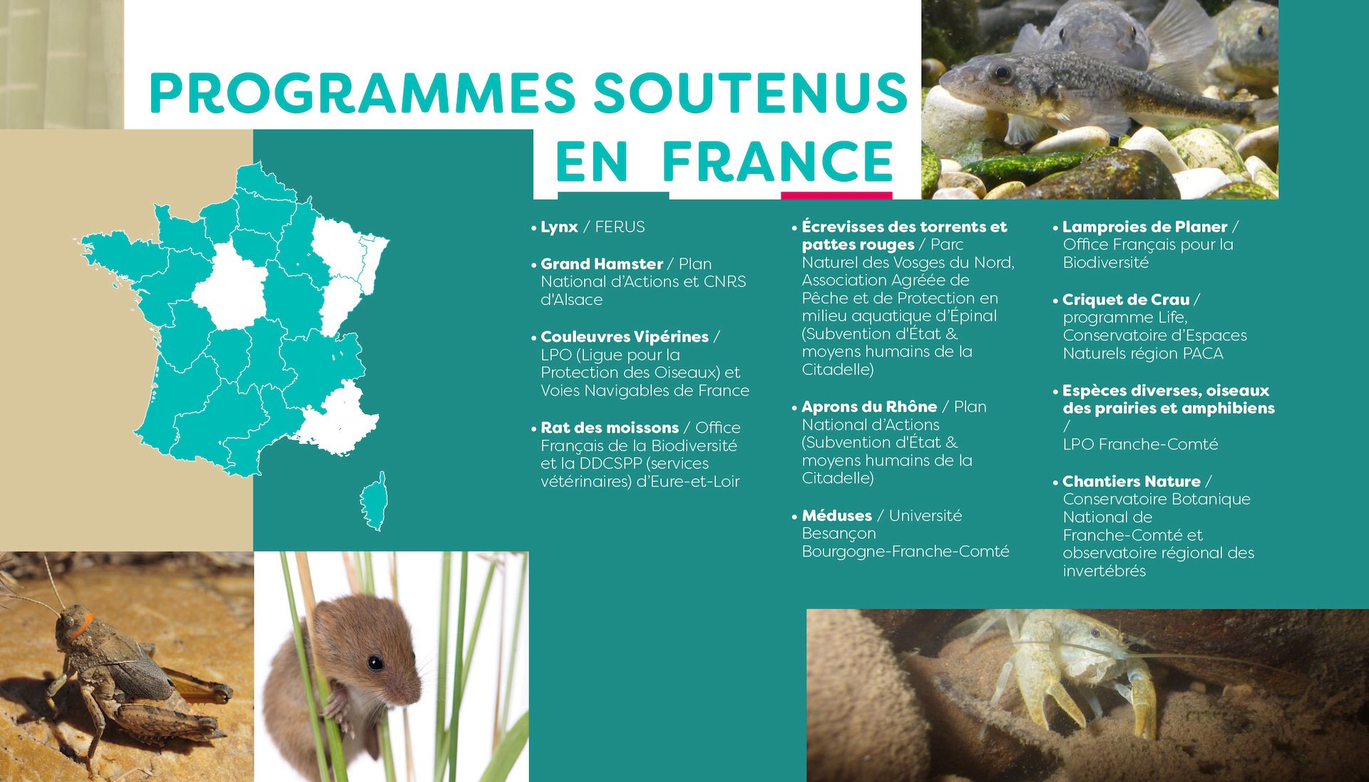 In totale, sono 47 i programmi di salvaguardia delle specie sostenuti in Francia e in tutto il mondo, di cui 6 progetti di reintroduzione.